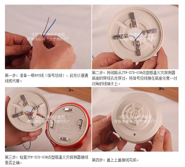 第二步:將線路從JTW-ZCD-G3N點型感溫火災探測器底座的穿線孔處穿過,將信號總線接在底座任意一對對角的線端子上。