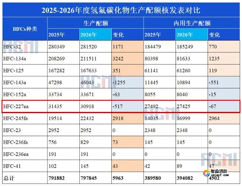相較于2025年生產(chǎn)配額31435噸,2026年七氟丙烷(HFC-227ea)生產(chǎn)配額減少了517噸;內(nèi)用生產(chǎn)配額較2025年減少67噸,具體如下: