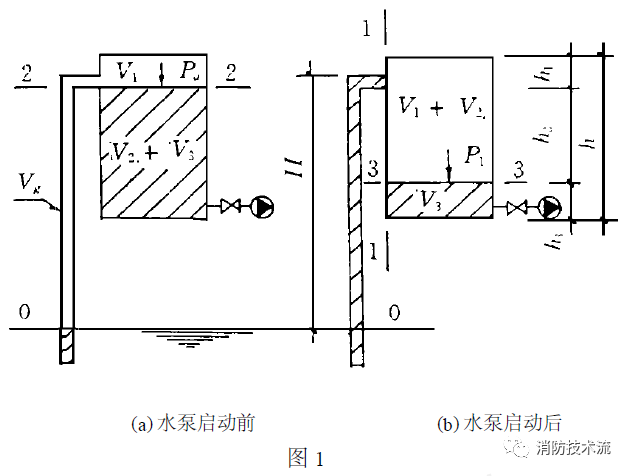 水泵啟動前,真空引水罐內的水應灌至真空引水罐能做到的大存水量,此時罐內部由水+空氣兩部分構成,液面上方的氣體容積為V1。罐內外的壓力與大氣壓力Pa相同。